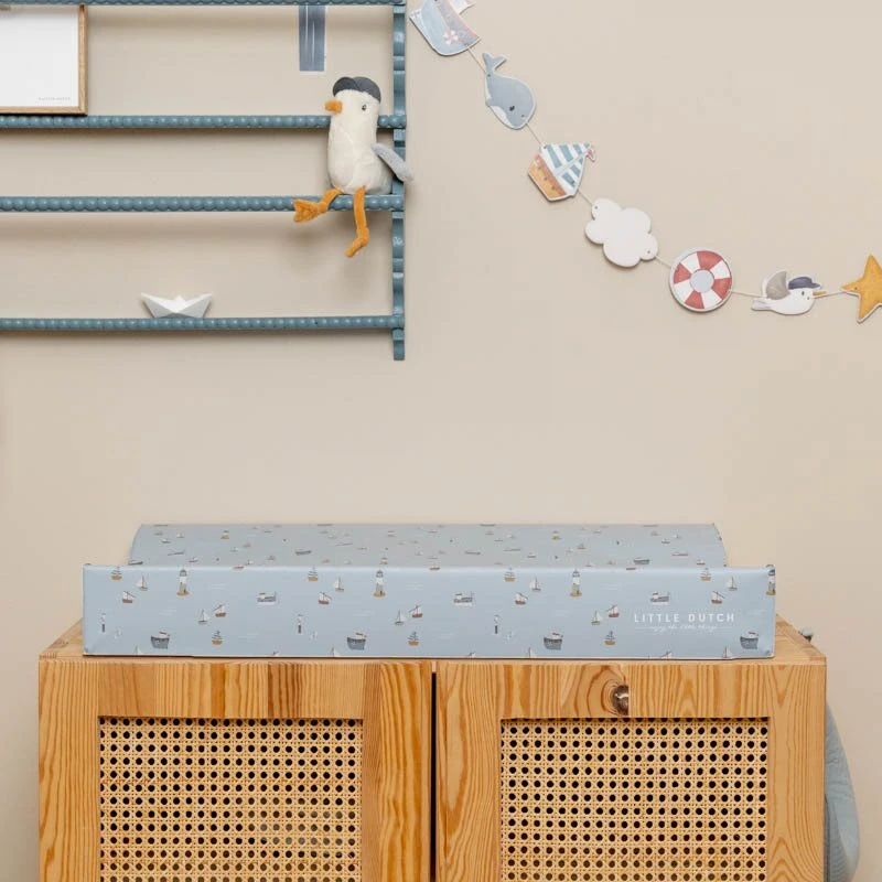 A lovely and sturdy changing mat made from PVC with a polyurethane foam interior. The changing mat features the familiar print from our Sailors Bay Blue collection. The changing mat has excellent water-repellent properties and is easy to clean with a moist cloth. Are you ready for a new print after a while? Use one of our changing mat covers to change the look of your changing mat.