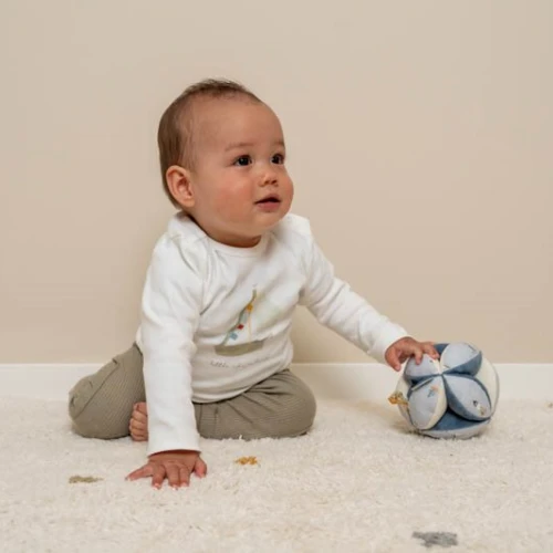 Reach and go for it! This gripping ball with its interesting shape makes for a great challenge for your little one. There are many spots to grab and explore with different textures and patterns. Itβs easy to pick up for little hands and when it moves the joyful sound of the bell rattle will cheer your baby on. On a light blue decor of Sailors Bay, the easy-to-grab knots and various labels will stimulate the senses, develop grip and keep your baby engaged in the playpen.