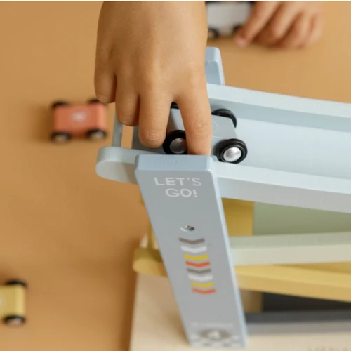 1, 2, 3, and start! With this cheerful wooden ramp racer including 4 cars your little one will have a great time. Place the cars one by one on top of the race track, let them go and they will race down. Kids love this!