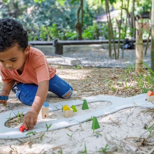 Pave your own path and go on a journey with the Rubber Road & Rail set! The flexibility of the rubber allows kids to create unique city infrastructure for play. This set comes complete with 11 pieces of two-sided rubber tracks, 2 cars, 3 buildings, and 3 bushes. (19 pieces in total)